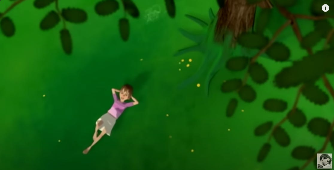 "L’Esprit s’approcha. Sa démarche provoqua le son de milles cristaux de glace s’entrechoquant et les grands vents du sud s’intensifièrent. Socéa soutint le regard de la créature. Transparent, opaque, glacé. Mais surtout, cette incroyable douceur, cette gentillesse sans limite. Socéa ne s’arrêta pas de chanter jusqu’à ce que le nez de la créature touche le sien. Dans un souffle rauque et glacial, l’Esprit s’évapora et Socéa se retrouva seule, au milieu de cette étendue blanche. Dans sa main droite elle caressait son pendentif et dans la gauche, elle sentit un objet qui n’y était pas. Une fleur gelée qui refléta les rayons du soleil.”
